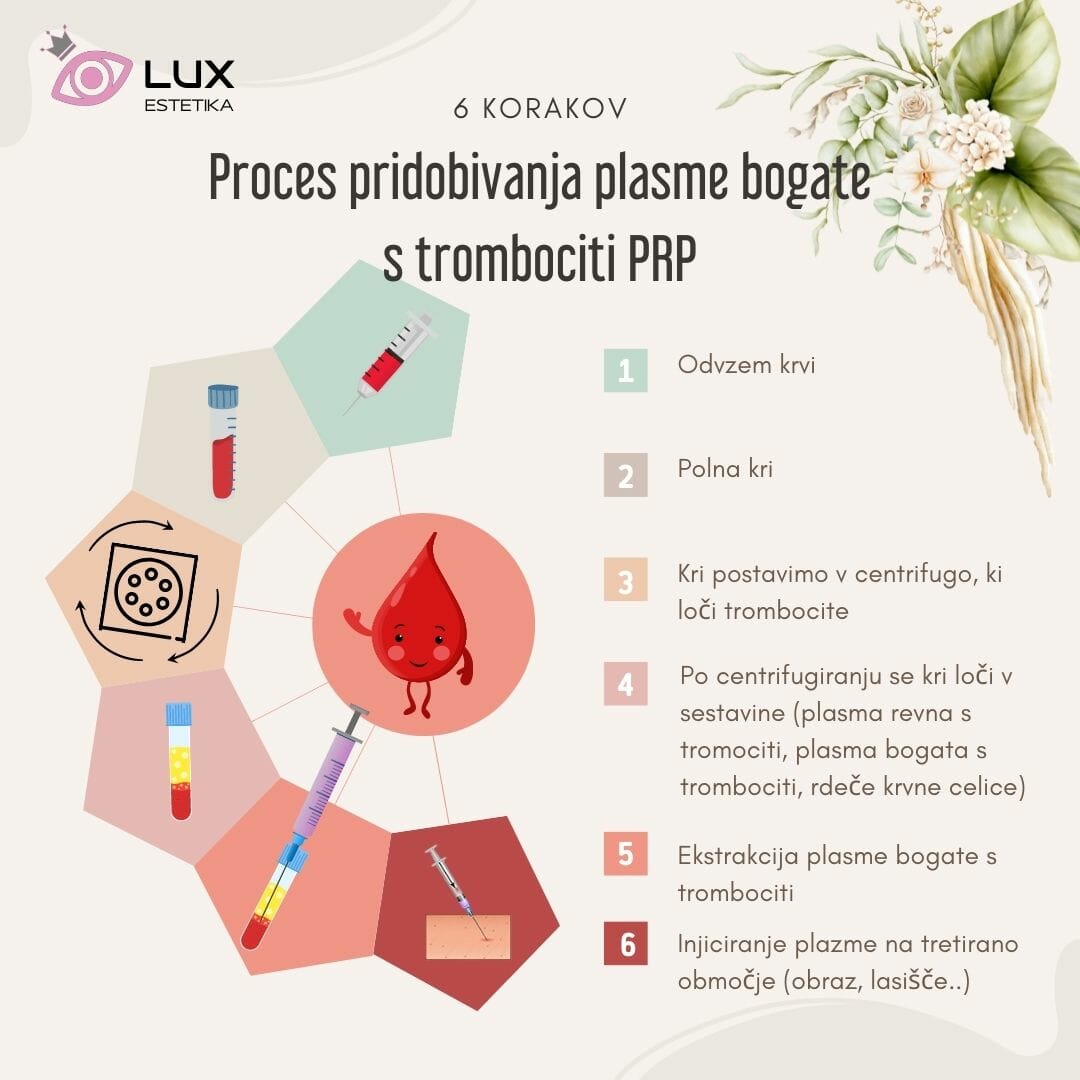 Ja, v LUX Estetiki apliciramo PRP plazmo obogateno s trombociti tudi za zdravljenje poškodovanih las. Vzamemo vašo kri, jo vstavimo v centrifugo in jo ločimo na sestavne dele: plazmo obogateno s trombociti, hormoni, vitamini in beljakovinami. Vse te sestavine injeciramo v vaše lasišče, te pa prekrvavijo in nahranijo lasne mešičke in spodbudijo ter pospešijo regeneracijo vašega lasišča (delitev celic).