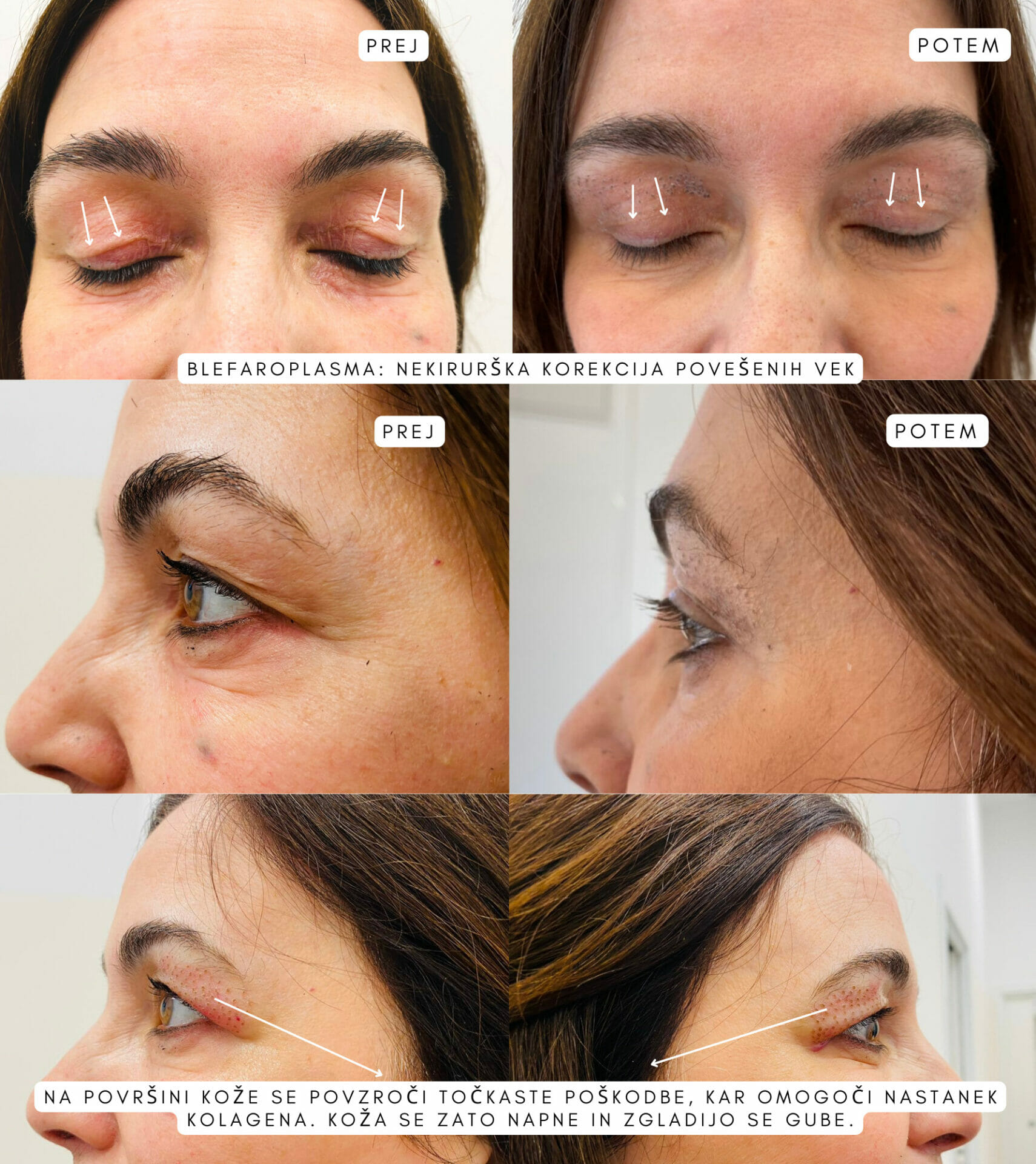Rečemo ji tudi nekirurška blefaroplastika ali zdravljenje z lastno plazmo. Gre za patentiran tretma brez operacije, ko v površinske sloje kože z aparatom povzročimo točkaste poškodbe na točno določenem mestu. Celjenje v tednih in mesecih po tretmaju povzroči nastanek novega kolagena, tako se koža ponovno napne, gube se zgladijo in obraz je videti bolj spočit. Rezultat je bolj napeta in manj povešena koža.