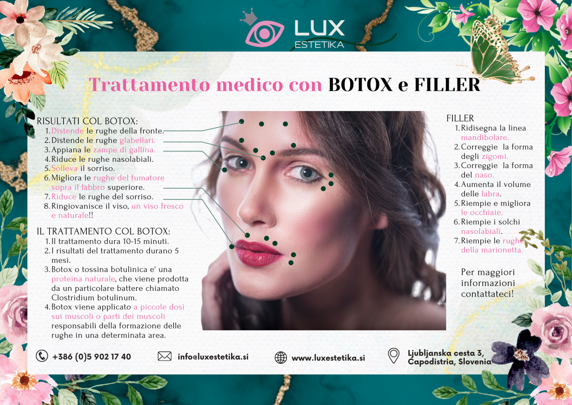 Se sei davvero infastidito da tutti questi problemi e desideri un viso piu’ fresco, giovane ma anche mantenere l’aspetto naturale del tuo viso, contatta la nostra clinica medica LUX Estetika a Capodistria, dove cancelleremo tutti questi problemi sotto controllo medico!