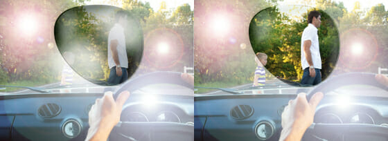 Na sliki: primerjava vidnega polja z zatemnjenimi stekli in s polariziranimi stekli.